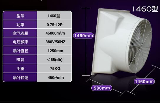 外框尺寸:1460*1460*850mm 風葉尺寸:1220mm 風葉材質:玻璃鋼材質 功率:750W 電壓:220V/380 傳動方式:直連式 百葉: PVC 噪音:50-65db 風量:45000 m3/h 重量:75KG